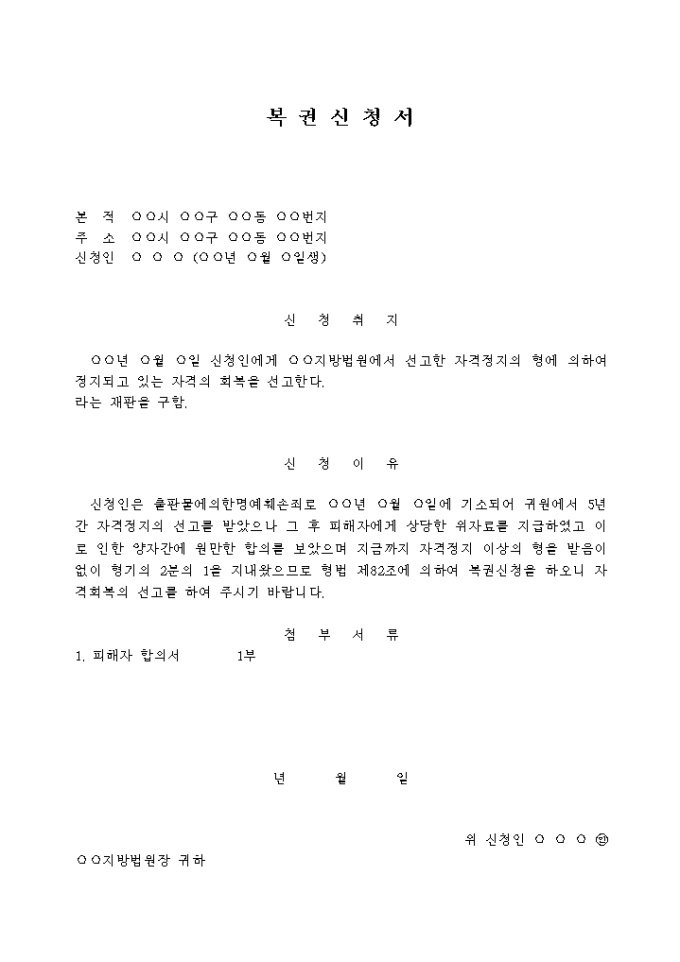 복권신청서(2) 입니다. 신 청 취 지 ○○년 ○월 ○일 신청인에게 ○○지방법원에서 선고한 자격정지의 형에 의하여 정지되고 있는 자격의 회복을 선고한다. 라는 재판을 구함. ...