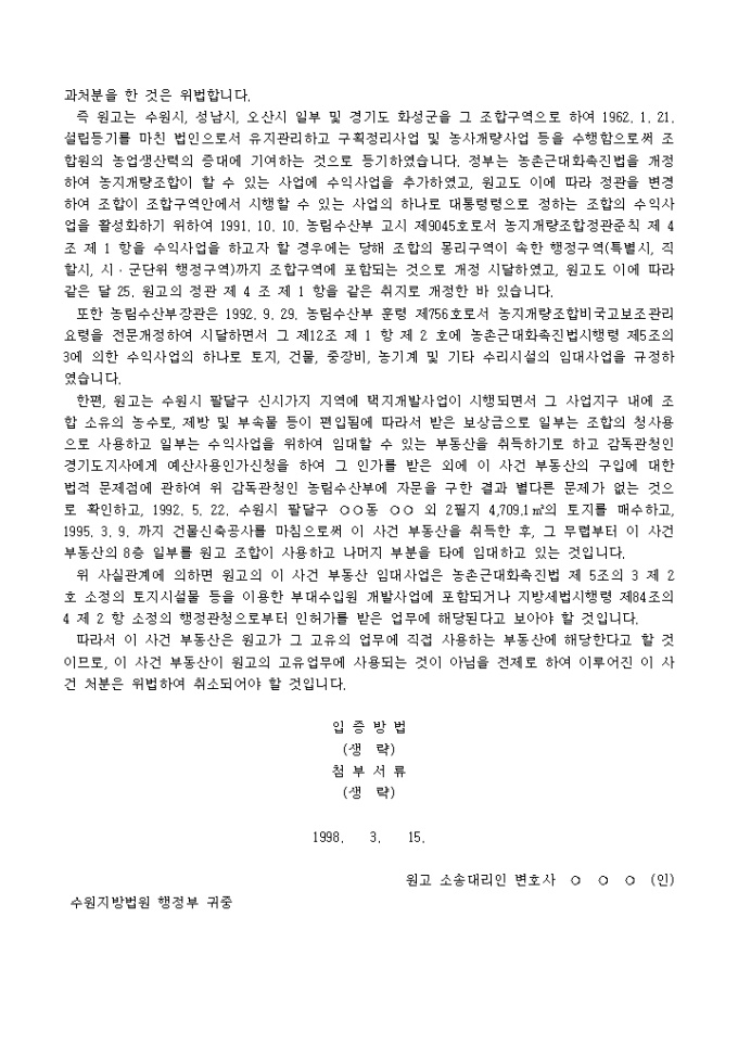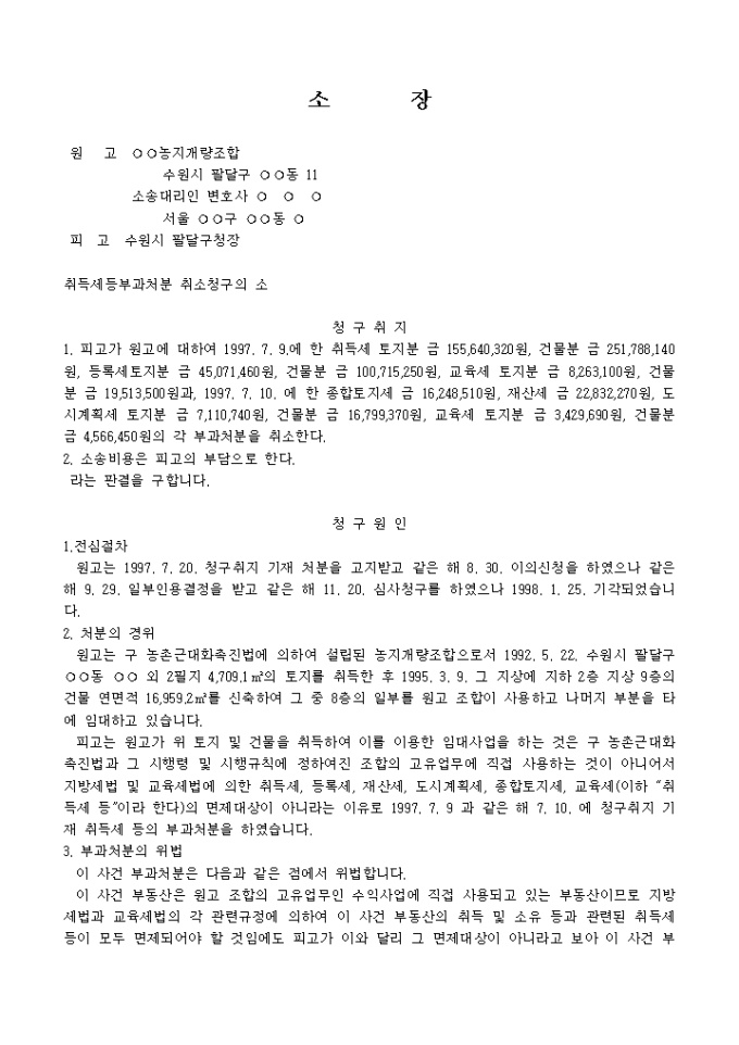 취득세등부과처분에 대하여 고유의 업무에 직접 사용하는 부동산이라는 이유로 부과처분의 취소를 구하는 소장양식입니다.