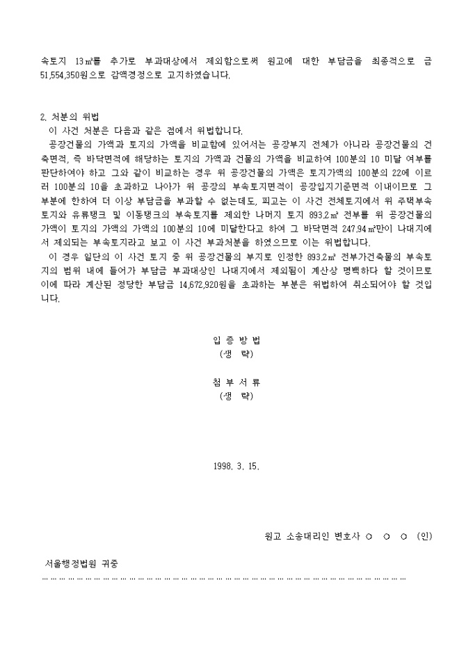 9,000원/월택지초과소유부담금부과처분에 대하여 건물의 부속토지 면적 산정의 잘못이 있다는 이유로 부과처분의 취소를 구하는 소장양식입니다.