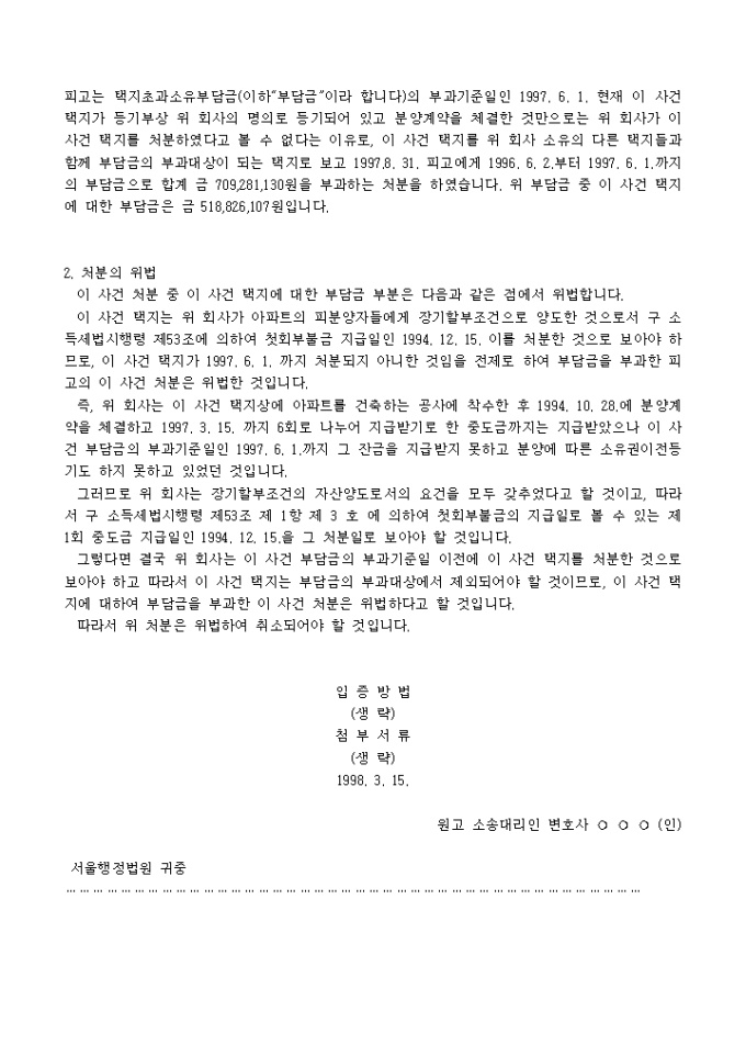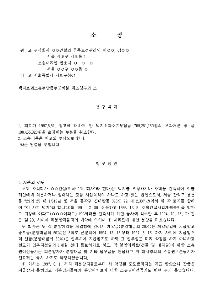 9,000원/월택지초과소유부담금부과처분에 대하여 처분시기의 인정에 위법이 있다는 이유로 처분취소를 구하는 소장양식입니다.