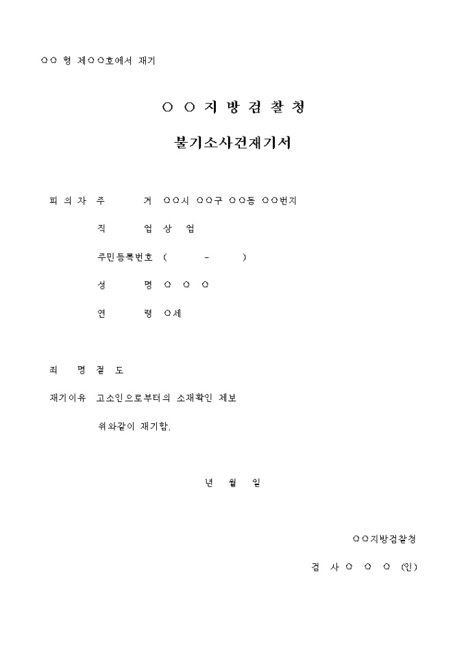 불기소사건재기서 입니다. 죄 명 절 도 재기이유 고소인으로 부터의 소재확인 제보 위와같이 재기함. ...