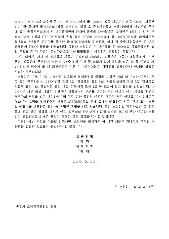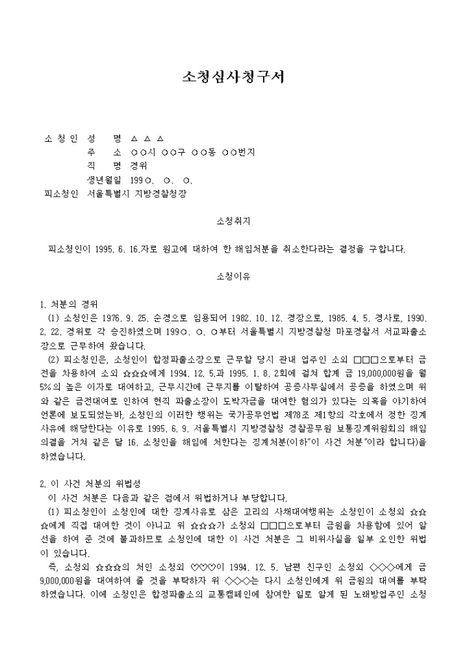 해임처분에 대하여 사실을 오인하고 재량권을 남용한 위법이 있다는 이유로 처분취소를 구하는 청구서양식입니다.