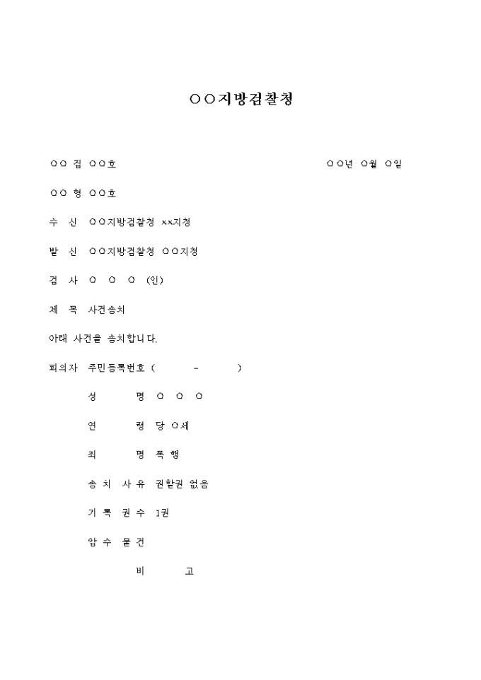 사건송치 입니다. 제 목 사건송치 아래 사건을 송치합니다. 피의자 주민등록번호 ( - ) 성 명 연 령 당 세 ...