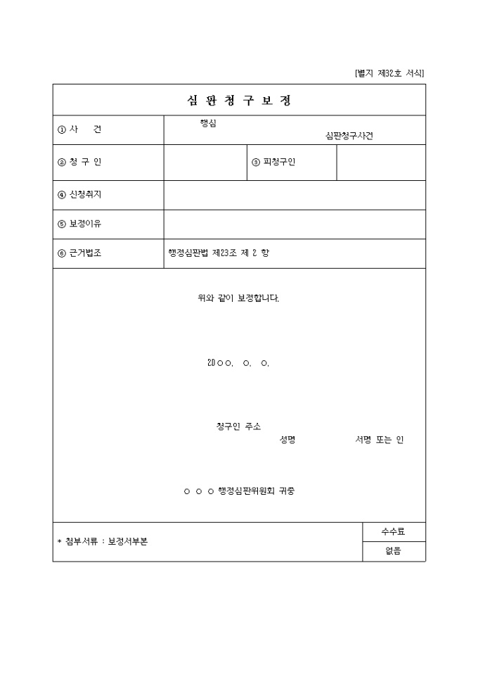 9,000원/월별지 제32호 서식 행정심판법 제23조 제 2 항에 근거하여 심판청구를 보정할 때 사용하는 양식입니다.