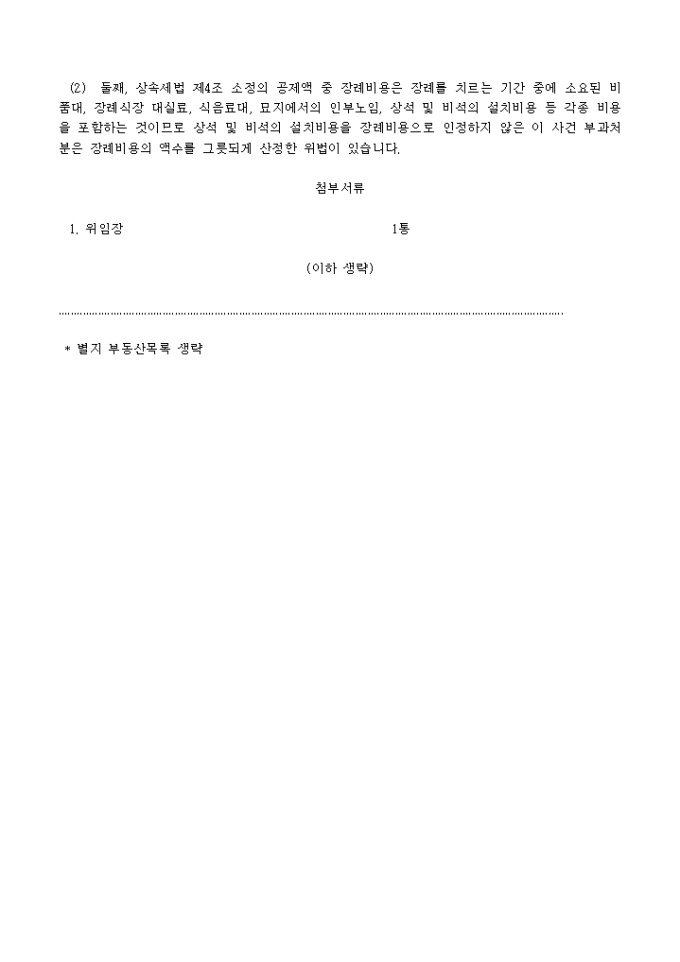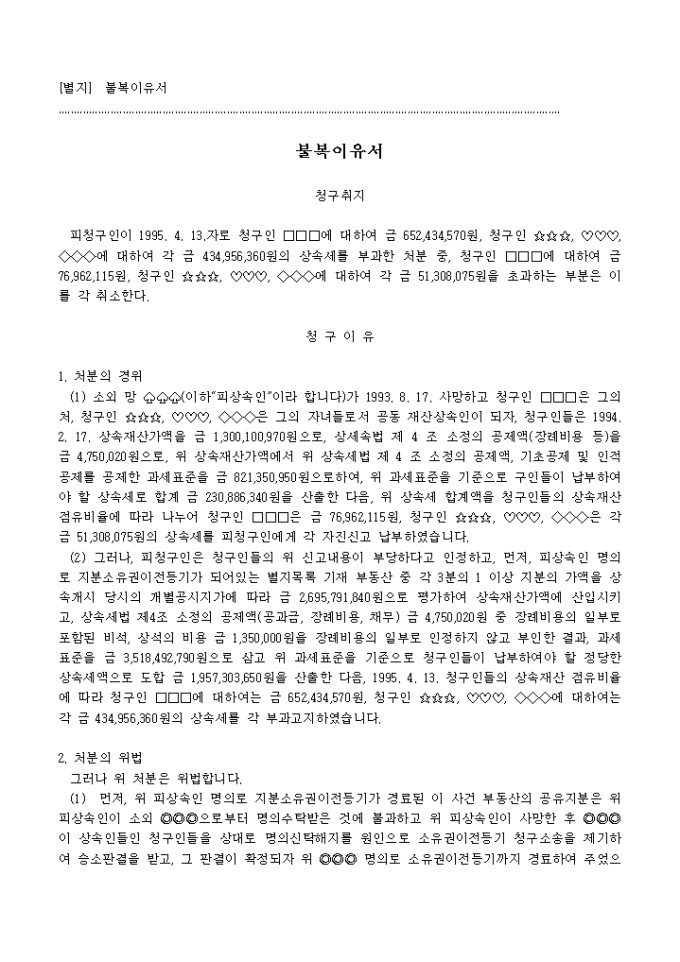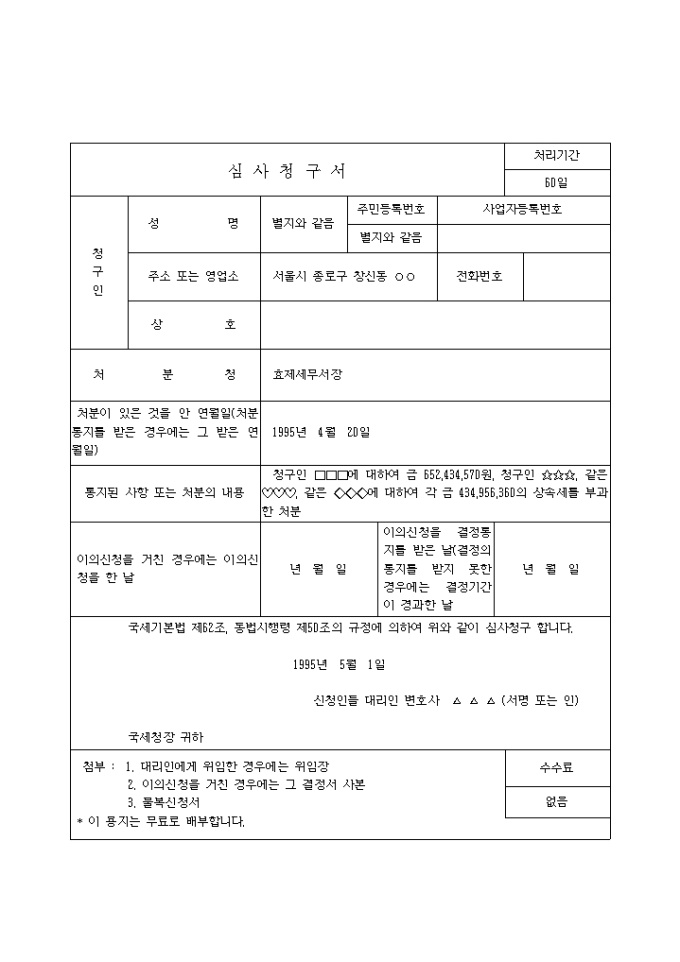 9,000원/월국세기본법 제62조, 동법시행령 제50조의 규정에 의하여 상속세의 부과처분에 대하여 명의신탁 자산에 불과하며 장례비용 등을 과소 인정한 위법이 있다는 이유로 처분취소를 구하는 청구서양식입니다.