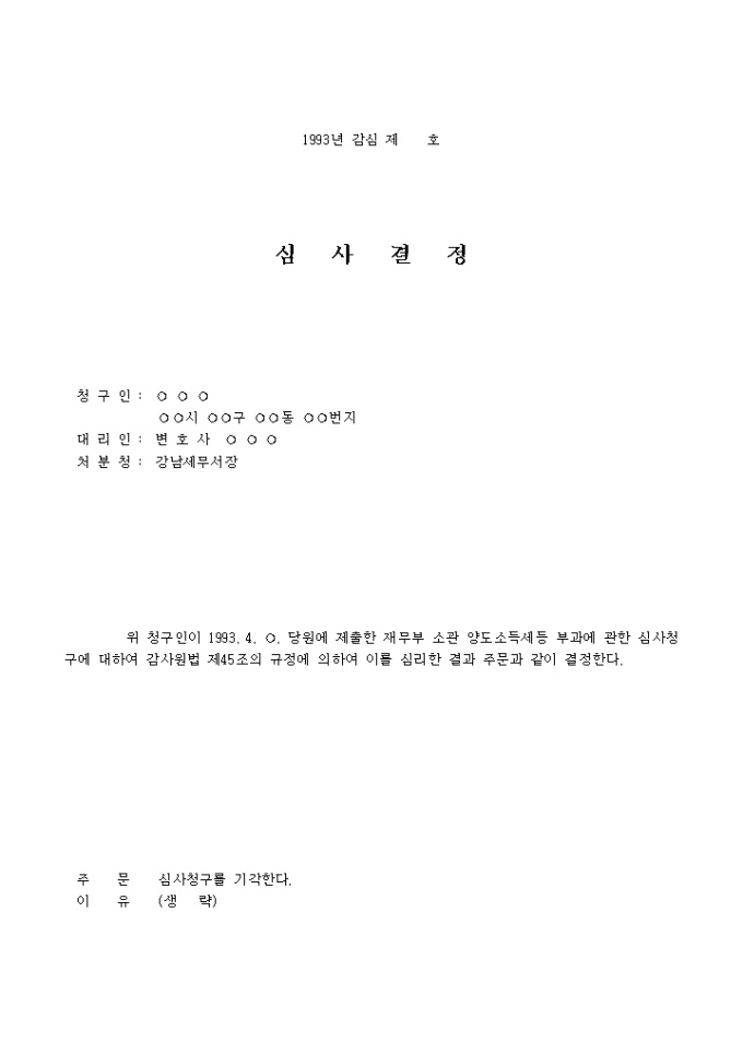 결정내용 : 청구인이 당원에 제출한 재무부 소관 양도소득세등 부과에 관한 심사청구에 대하여 감사원법 제45조의 규정에 의하여 이를 심리한 결과 심사청구를 기각한다.