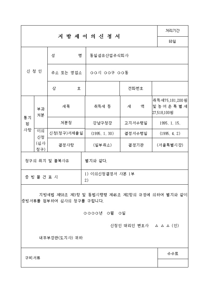 9,000원/월지방세법 제58조 제3항 및 동법시행령 제46조 제2항의 규정에 의하여 취득세 중과대상인 고급오락장에 해당하지 아니한다는 이유로 처분취소를 구하는 청구서양식입니다.