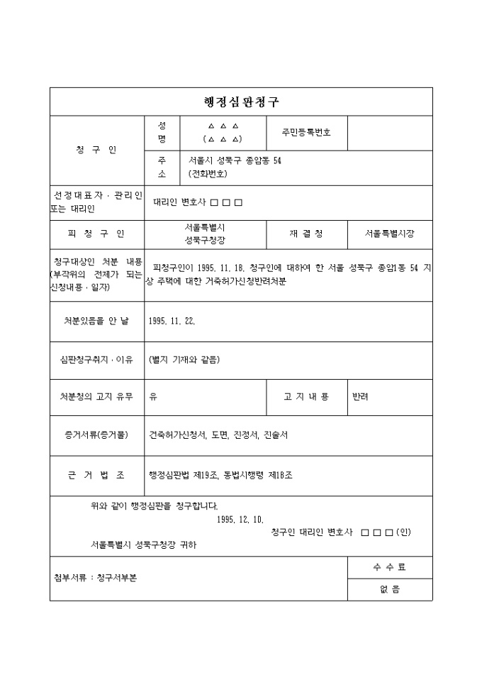 9,000원/월행정심판법 제19조, 동법시행령 제18조에 근거한 건축허가신청반려처분에 대하여 불허사유가 없고 종전의 약속에 반한다는 이유로 처분취소를 구하는 청구서양식입니다.