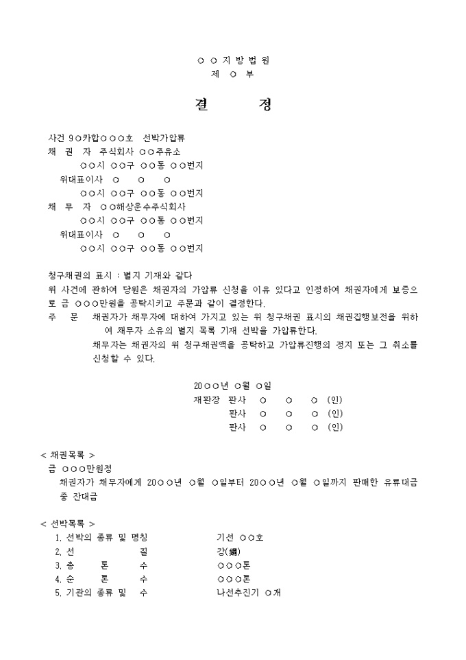 선박가압류결정 입니다. 청구채권의 표시 : 별지 기재와 같다 위 사건에 관하여 당원은 채권자의 가압류 신청을 이유 있다고 인정하여 채권자에게 보증으로 금 만원을 공탁시키고 주문과 같이 결정한다. ...