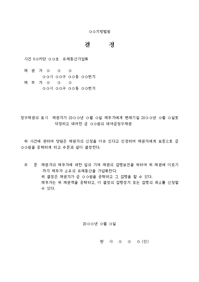 9,000원/월유체동산가압류결정(공탁을 집행조건부로 결정하는 예) 입니다.