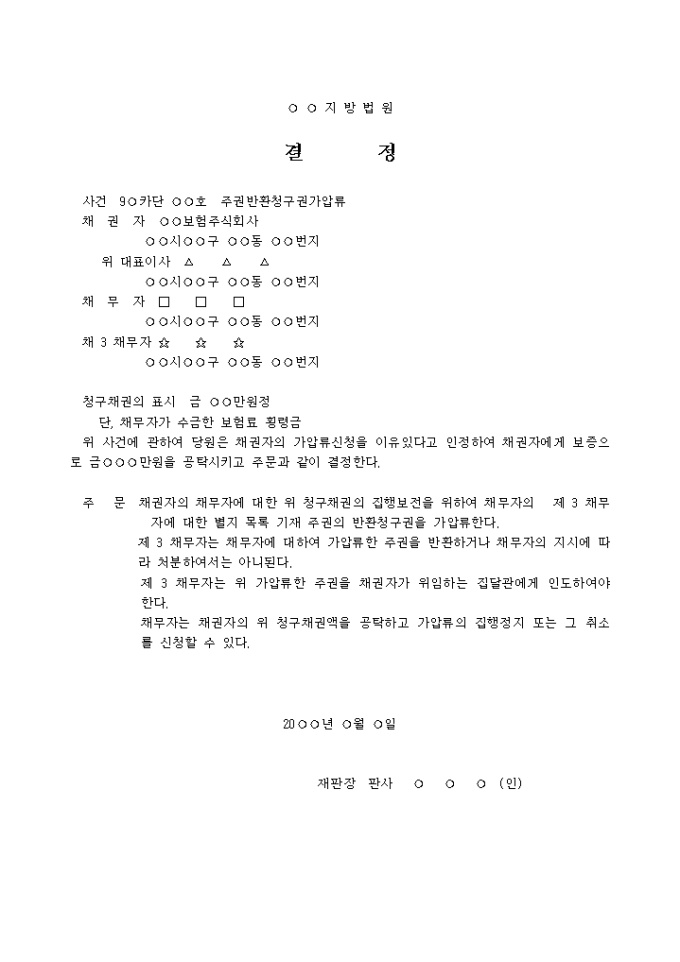 주권반환청구권가압류결정 예제 입니다. 주 문 채권자의 채무자에 대한 위 청구채권의 집행보전을 위하여 채무자의 제 3 채무자에 대한 별지 목록 기재 주권의 반환청구권을 가압류한다. 제 3 채무자는 채무자에 대하여 가압류한 주권을 반환하거나 채무자의 지시에 따라 처분하여 서는 아니된다. ...