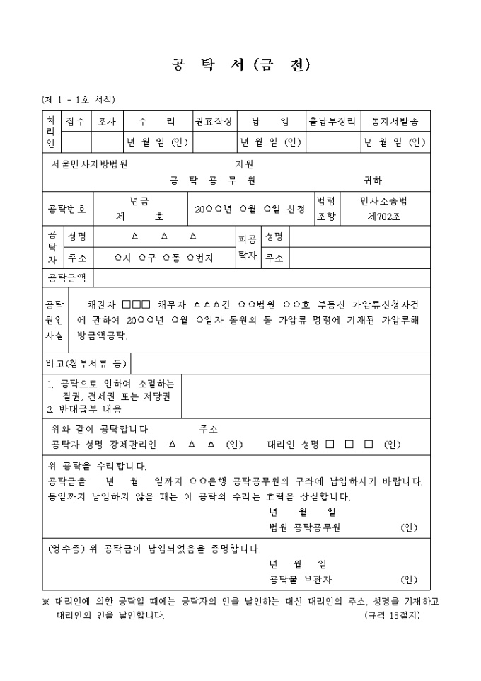 가압류해방공탁서 예제 입니다. 공탁원인사실 채권자 □□□ 채무자 간 법원 호 부동산 가압류신청사건에 관하여 20 년 월 일자 동원의 동 가압류 명령에 기재된 가압류해방금액공탁. ...