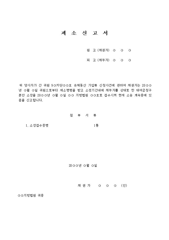 제소신고서 입니다. 위 당사자가 간 귀원 9○카단○○호 유체동산 가압류 신청사건에 관하여 채권자는 20○○년 ○월 ○일 귀원으로 부터 제소명령을 받고 소정기간내에 채무자를 상대로 한 대여금청구 본안 소장을 20○○년 ○월 ○일 ○○ 지방법원 ○○호로 접수시켜 현재 소송 계속중에 있음을 신고합니다. ...