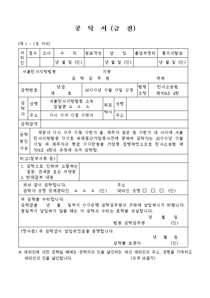 채권자 시 구 동 번지 을, 채무자 같은 동 번지 내 사이에 서울민사지방법원 호 유체동산가압류사건에 관하여 공탁자는 20 년 월 일 위 채무자의 현금 만원을 가압류 집행하였으므로 민사소송법 제709조 4항의 규정에 의거 공탁함.