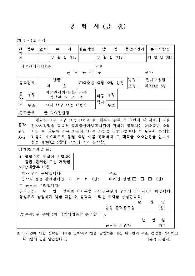채권자 시 구 동 번지 을, 채무자 같은 동 번지 내 사이에 서울민사지방법원 호 유체동산가압류사건에 관하여 공탁자는 20 년 월 일 위 채무자 소유 자동차 1대를 가압류 집행하였으나 그 보관에 다대한 비용이 소요되므로 동월 일 이를 경매하여 그 매득금 만원을 민사소송법 제709조 5항의 규정에 의거 공탁함.