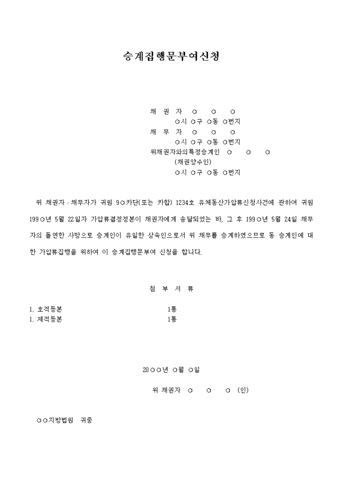 위 채권자․채무자가 귀원 9○카단(또는 카합) 1234호 유체동산가압류신청사건에 관하여 귀원 199○년 5월 22일자 가압류결정정본이 채권자에게 송달되었는 바, 그 후 199○년 5월 24일 채무자의 돌연한 사망으로 승계인이 유일한 상속인으로서 위 채무를 승계하였으므로 동 승계인에 대한 가압류집행을 위하여 이 승계집행문부여 신청을 합니다.