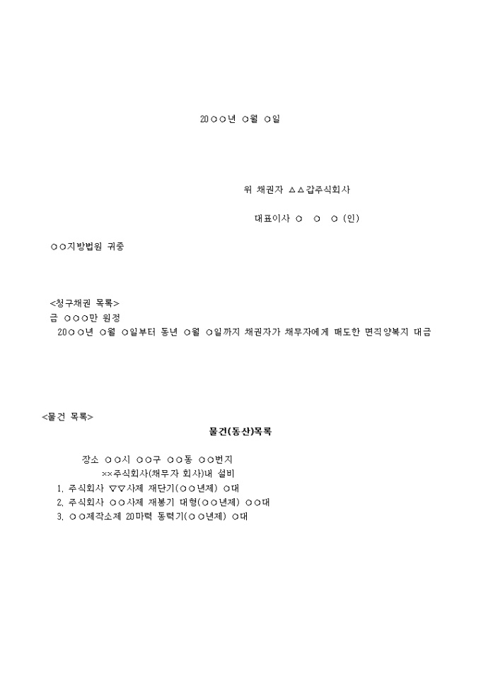 채권자가 채무자에 대하여 가진 청구채권의 집행보전을 위하여 채무자 소유의 별지 물건목록의 유체동산을 가압류한다.