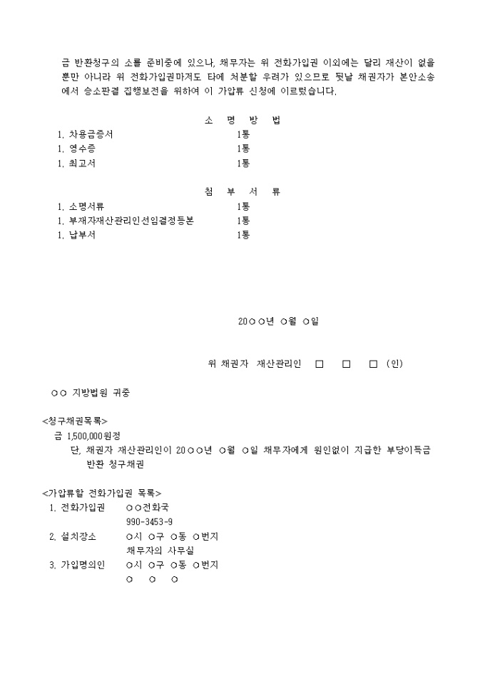부당이익금반환청구권에 의한 전화가입권 가압류신청서 예제 입니다.