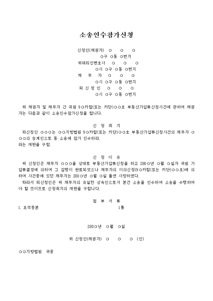 9,000원/월소송인수참가신청서 예제 입니다. 신 청 취 지 피신청인 는 지방법원 9 카합(또는 카단) 호 부동산가압류신청사건의 채무자 의 승계인으로 동 소송에 참가 인수하라. 라는 재판을 구함. 신 청 이 유 위 신청인은 채무자 을 상대로 부동산가압류신청을 하고 200 년 월 일자 귀원 가압류결정에 의하여 그 집행이 완료되었으나 채무자의 이의신청(9 카합(또는 카단) 호)에 의하여 사건중에 있던 채무자는 2