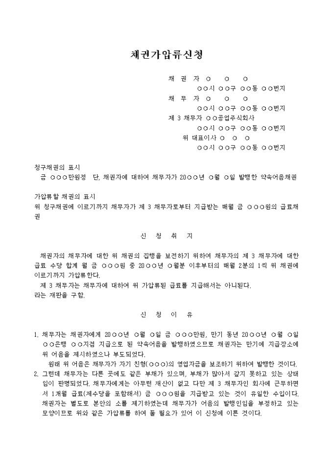 채권자의 채무자에 대한 위 채권의 집행을 보전하기 위하여 채무자의 제 3 채무자에 대한 급료 수당 합계 월 금 원 중 20 년 월분 이후부터의 매월 2분의 1씩 위 채권에 이르기까지 가압류한다.