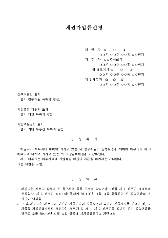 약속어음금청구권에 의한 저당권부채권 가압류신청서 예제 입니다.