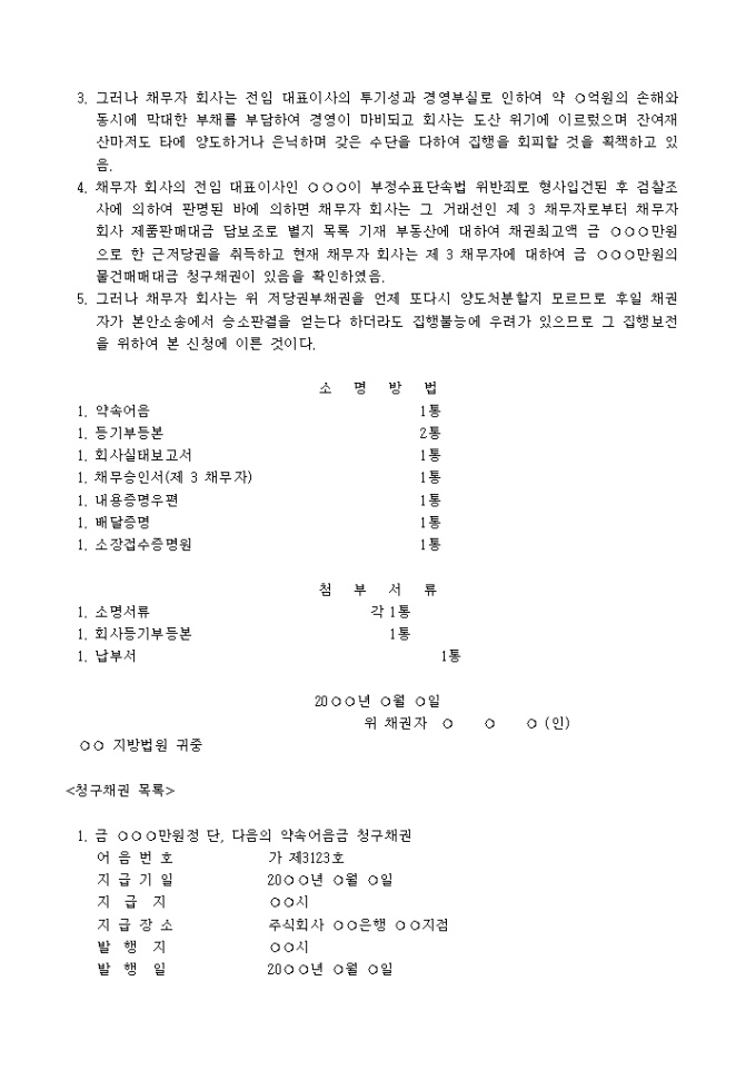 1. 채권자는 채무자 발행의 위 청구채권 목록 기재의 약속어음 1매를 제 1 배서인 무역주식회사, 제 2 배서인 을 통하여 20 년 월 일 취득하여 위 약속어음의 소지인이 되었음.
