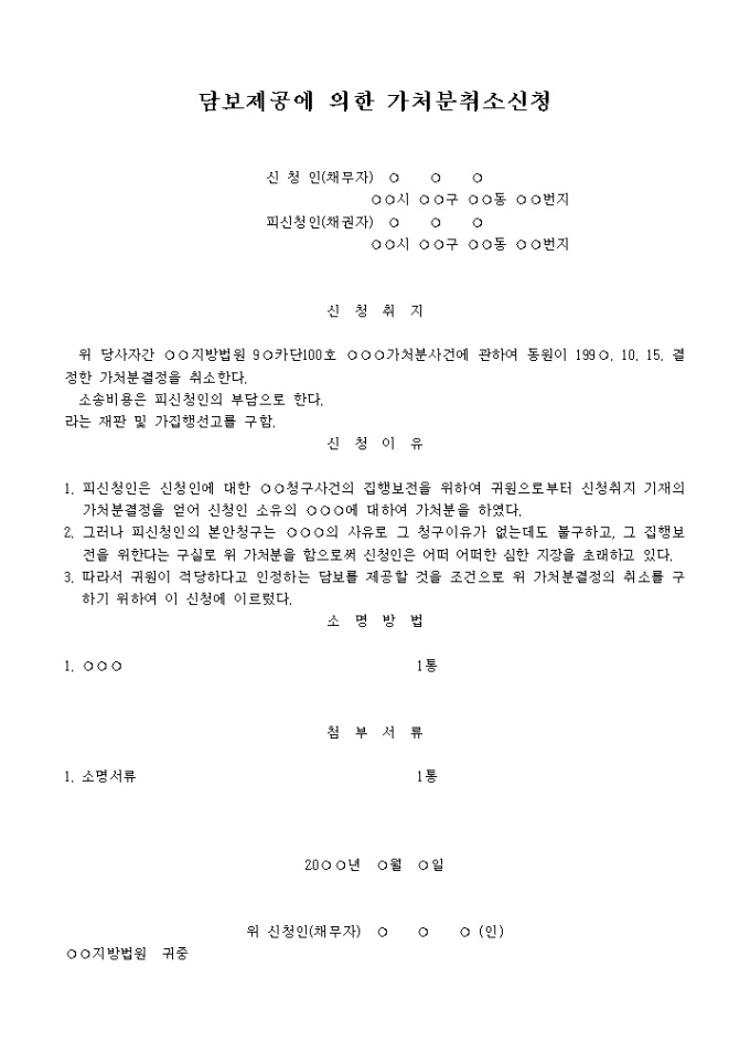 9,000원/월담보제공에 의한 가처분취소신청서 예제 입니다.