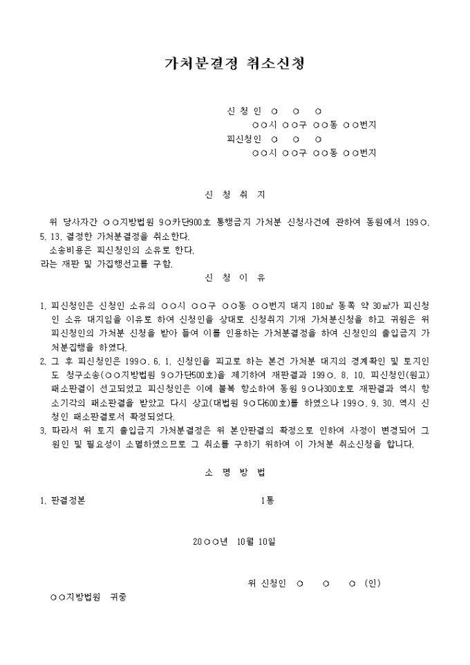 9,000원/월사정변경에 의한 통행금지 가처분결정 취소신청서(본안에서 원고패소판결이 확정된 경우) 예제 입니다.