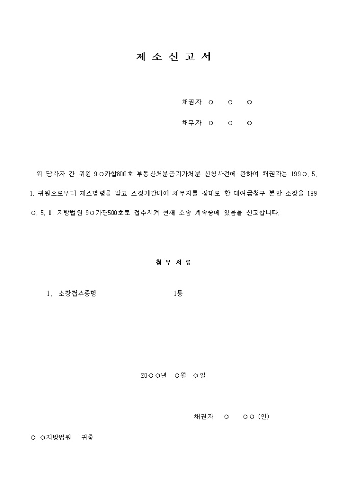 제소신고서 입니다. 위 당사자 간 귀원 9○카합800호 부동산처분금지가처분 신청사건에 관하여 채권자는 199○. 5. 1. 귀원으로 부터 제소명령을 받고 소정기간내에 채무자를 상대로 한 대여금청구 본안 소장을 199○. 5. 1. 지방법원 9○가단500호로 접수시켜 현재 소송 계속중에 있음을 신고합니다. ...