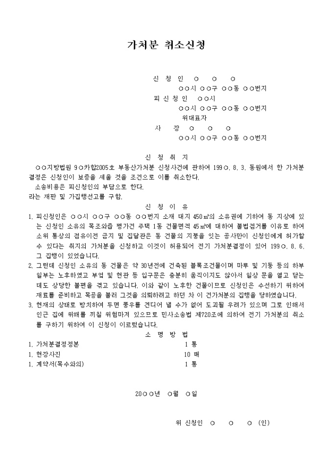 지방법원 9 카합2005호 부동산가처분 신청사건에 관하여 199 . 8. 3. 동원에서 한 가처분결정은 신청인이 보증을 세울 것을 조건으로 이를 취소한다.