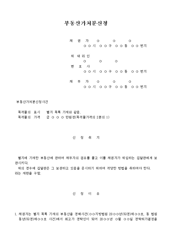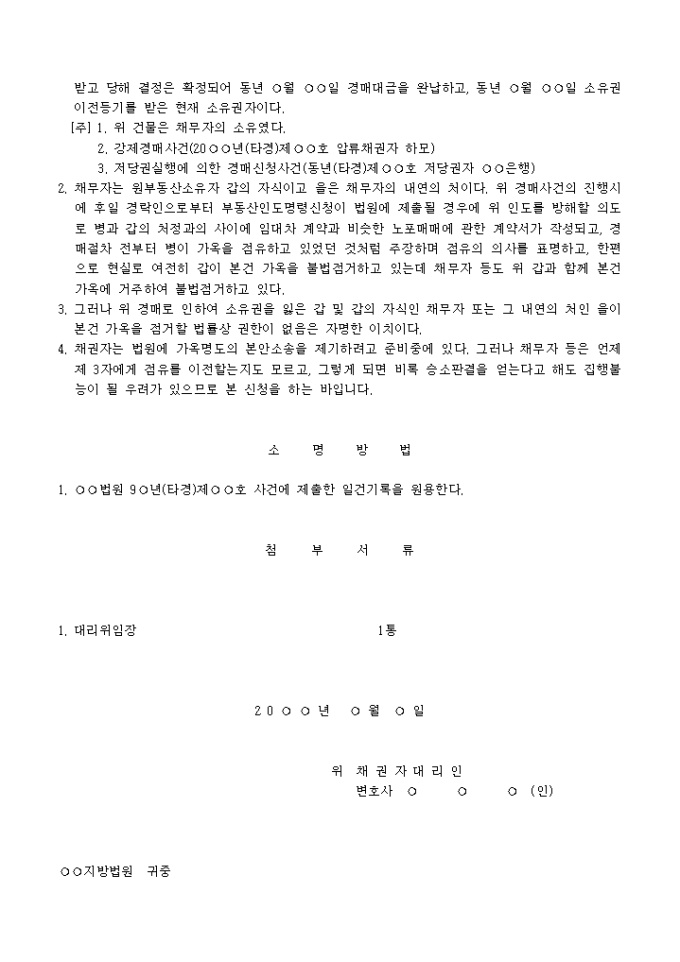 9,000원/월건물 집달관보관 가처분신청서(소유권에 기한 경락부동산인도방해자에 대한 가옥명도청구) 예제 입니다.