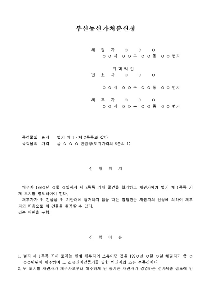 1. 별지 제 1목록 기재 토지는 원래 채무자의 소유이던 것을 199 년 월 일 채권자가 금 만원에 매수하여 그 소유권이전등기를 필한 채권자의 소유 부동산이다.