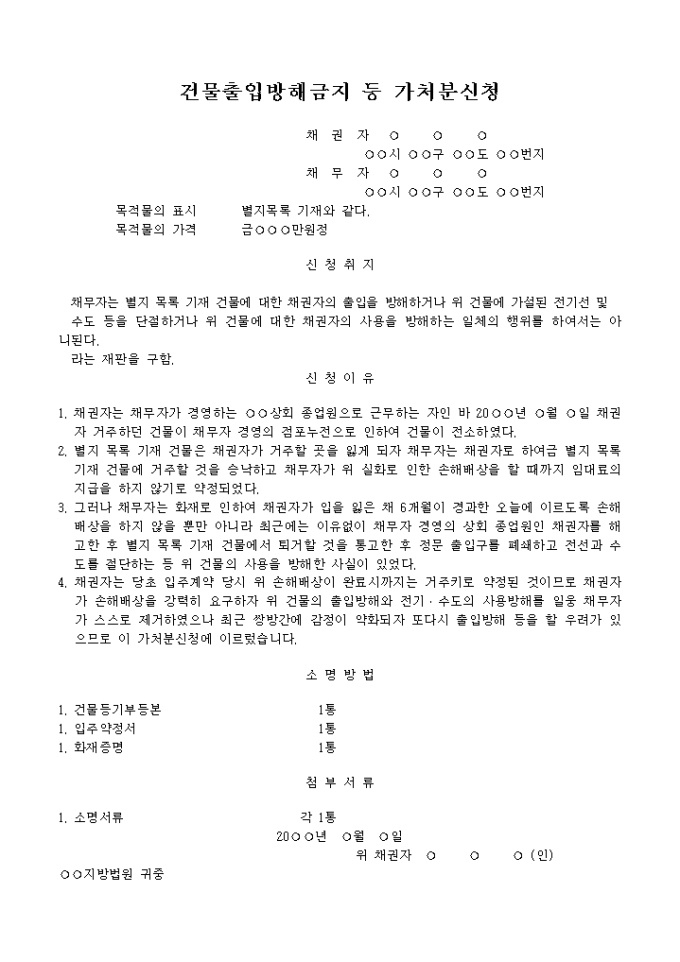 9,000원/월건물출입 및 사용방해금지 가처분신청서 예제 입니다.