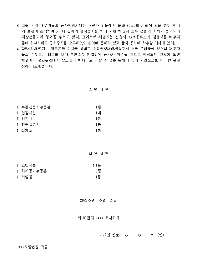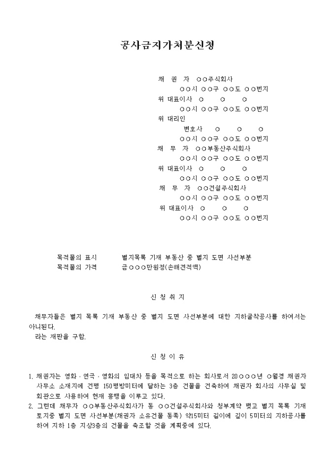 공사금지 가처분신청서(기존건물 붕괴방지를 위한 공사금지 가처분) 예제 입니다.