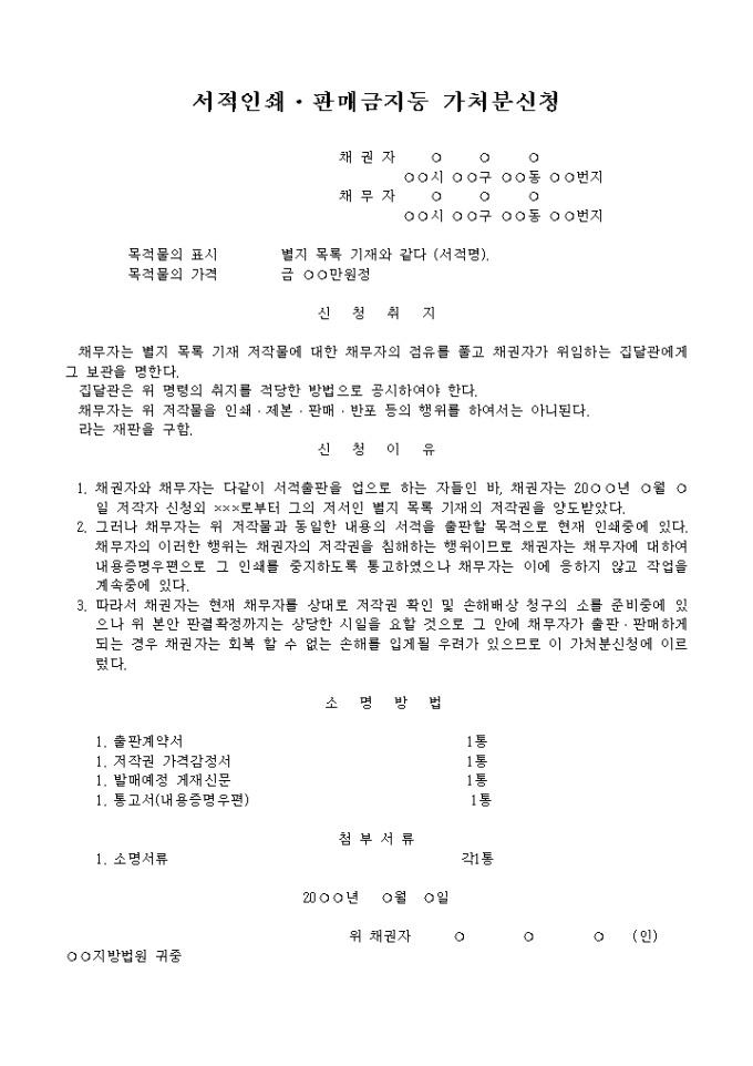서적의 인쇄,판매금지 등 가처분신청서 예제 입니다.