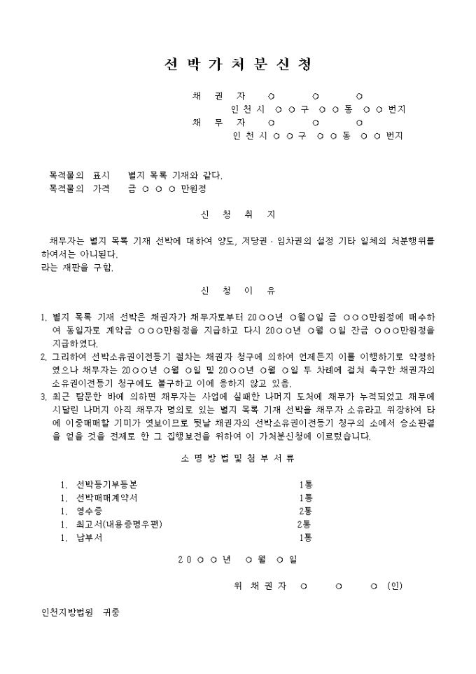9,000원/월선박처분금지 가처분신청서(선박소유권이전등기청구권보전) 예제 입니다.
