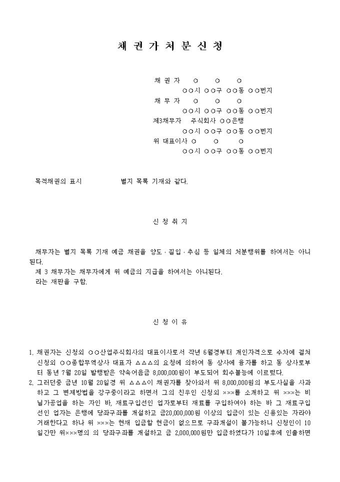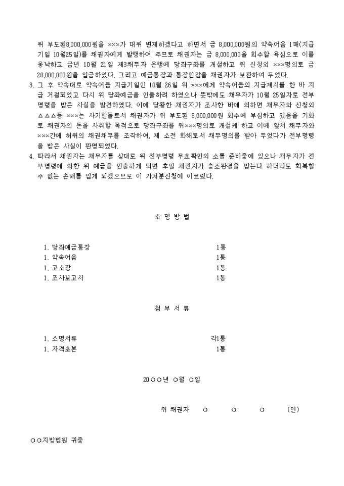 9,000원/월예금채권의 추심,양도금지 가처분신청서(전부명령무효확인청구권보전) 예제 입니다.