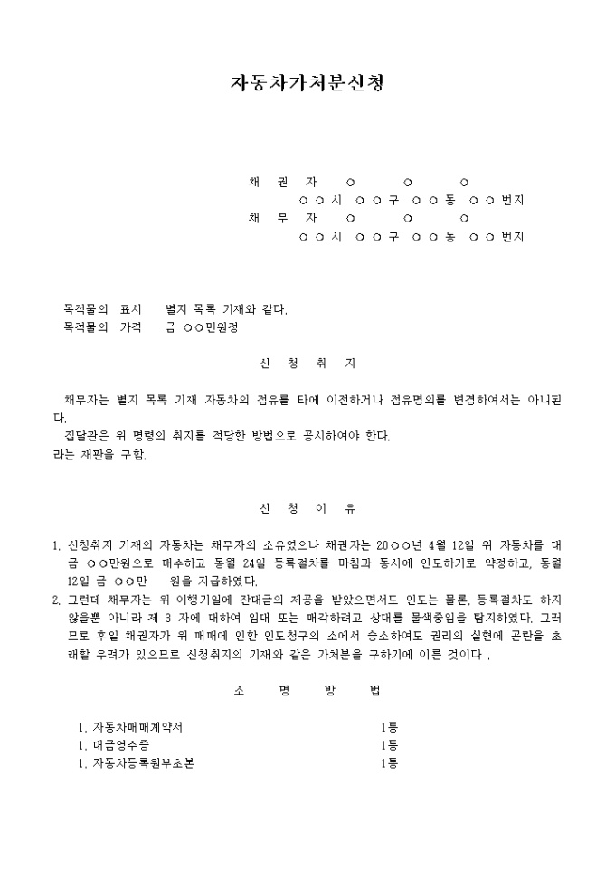 1. 신청취지 기재의 자동차는 채무자의 소유였으나 채권자는 20 년 4월 12일 위 자동차를 대금 만원으로 매수하고 동월 24일 등록절차를 마침과 동시에 인도하기로 약정하고, 동월 12일 금 만 원을 지급하였다.