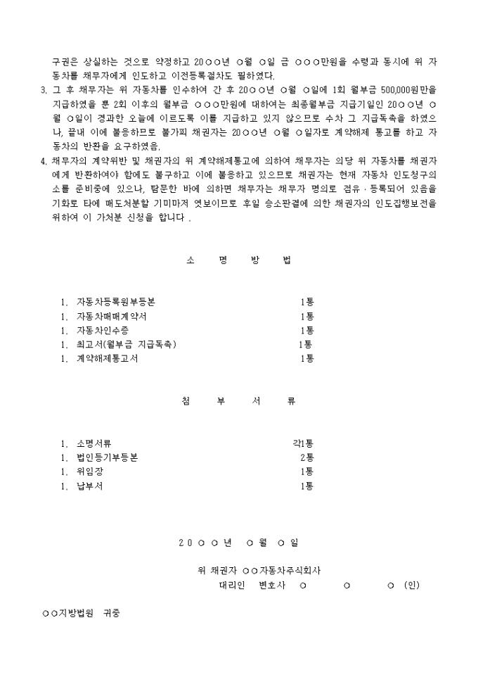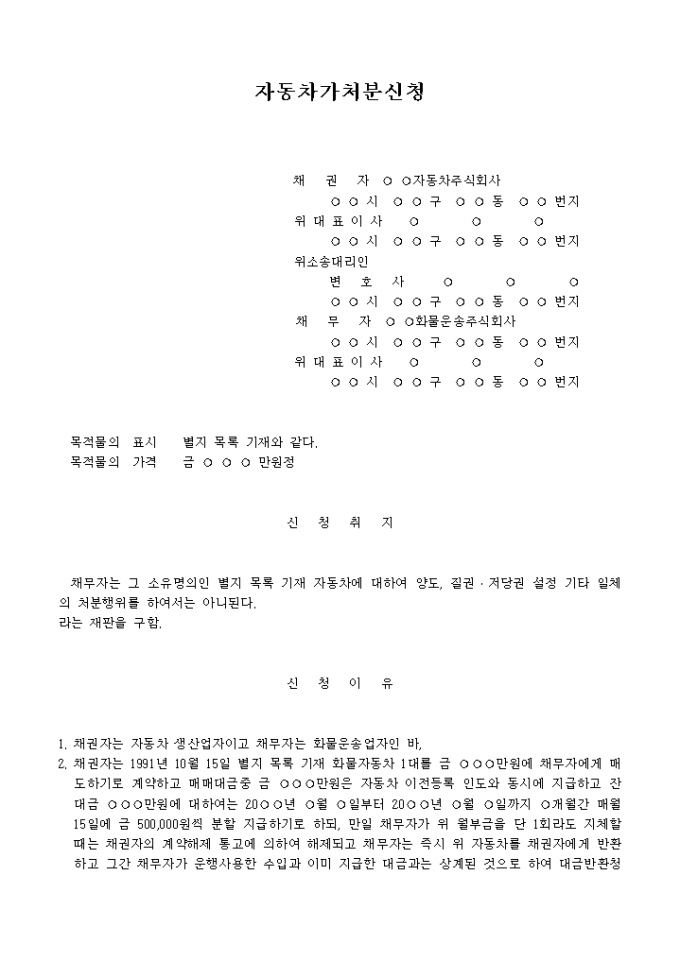2. 채권자는 1991년 10월 15일 별지 목록 기재 화물자동차 1대를 금 ○○○만원에 채무자에게 매도하기로 계약하고 매매대금중 금 ○○○만원은 자동차 이전등록 인도와 동시에 지급하고 잔대금 ○○○만원에 대하여는 20○○년 ○월 ○일부터