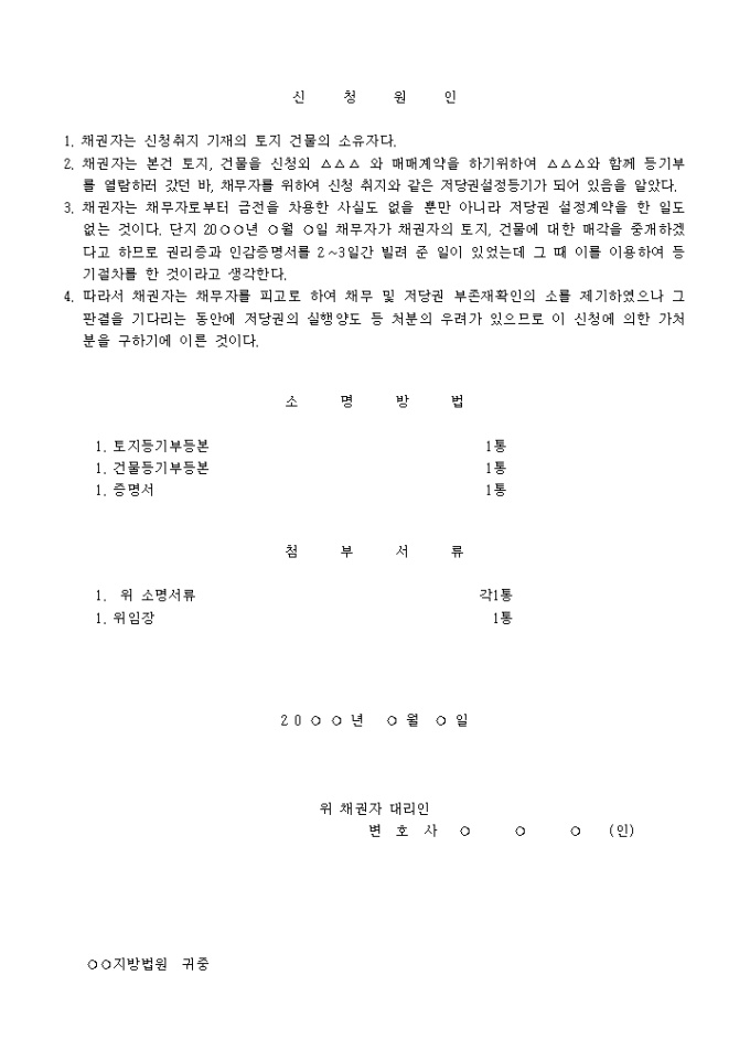 2. 채권자는 본건 토지, 건물을 신청외 와 매매계약을 하기위하여 와 함께 등기부를 열람하러 갔던 바, 채무자를 위하여 신청 취지와 같은 저당권설정등기가 되어 있음을 알았다.
