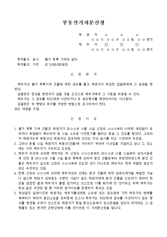 9,000원/월집달관보관 채무자사용허가 점유이전금지 가처분신청서 예제 입니다.