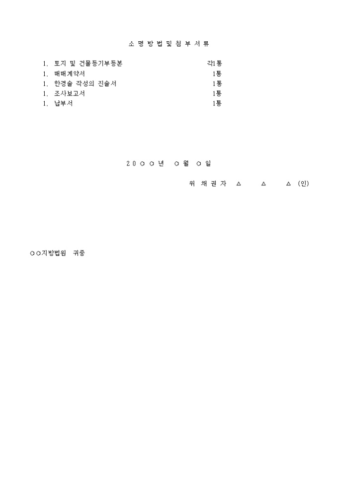 1. 별지 목록 기재 건물은 채권자가 20 년 월 일 신청외 부터 아무런 제한없이 또 하자나 부담없이 매수하여 동 일 소유권 이전등기를 필하고 동일 그 인도를 받았다. 그리하여 채권자는위 부동산의 채권자의 점유하에 있다는 지의 표시를 하고 시정하여 두었음.