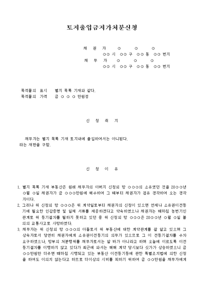 9,000원/월토지출입금지 가처분신청서(농지경작방해금지) 예제 입니다.