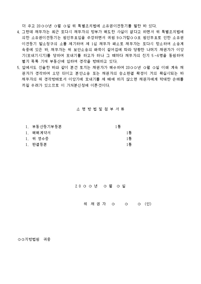 1. 별지 목록 기재 부동산은 원래 채무자의 아버지 신청외 망 ○○○의 소유였던 것을 20○○년 ○월 ○일 채권자가 금 ○○○만원에 매수하여 그 때부터 채권자가 점유 경작하여 오는 경작지이다.