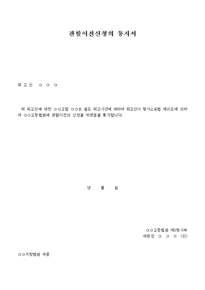 9,000원/월관할이전신청의통지서(피고인이신청한경우) 입니다. 위 피고인에 대한 고합 호 절도 피고사건에 대하여 피고인이 형사소송법 제15조에 의하여 고등법원에 관할이전의 신청을 하였음을 통지합니다. ...