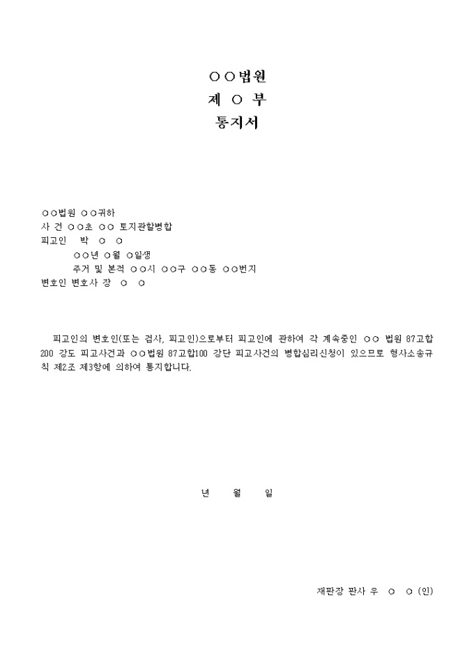 9,000원/월토지관할의병합심리통지서 입니다. 피고인의 변호인(또는 검사, 피고인)으로 부터 피고인에 관하여 각 계속중인 ○○ 법원 87고합200 강도 피고사건과 ○○법원 87고합100 강단 피고사건의 병합심리신청이 있으므로 형사소송규칙 제2조 제3항에 의하여 통지합니다 ...