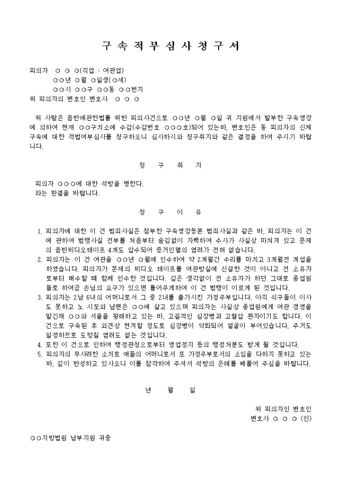 구속적부심사청구서(4) 예제 입니다. 청 구 취 지 피의자 ○○○에 대한 석방을 명한다. 라는 판결을 바랍니다. 청 구 이 유 1. 피의자에 대한 이 건 범죄사실은 첨부한 구속영장등본 범죄사실과 같은 바, 피의자는 이 건에 관하여 범행사실 전부를 처음부터 숨김없이 자백하여 수사가 사실상 마쳐져 있고 문제의 음반비디오테이프 4개도 압수되어 증거인멸의 염려가 전혀 없습니다. ...