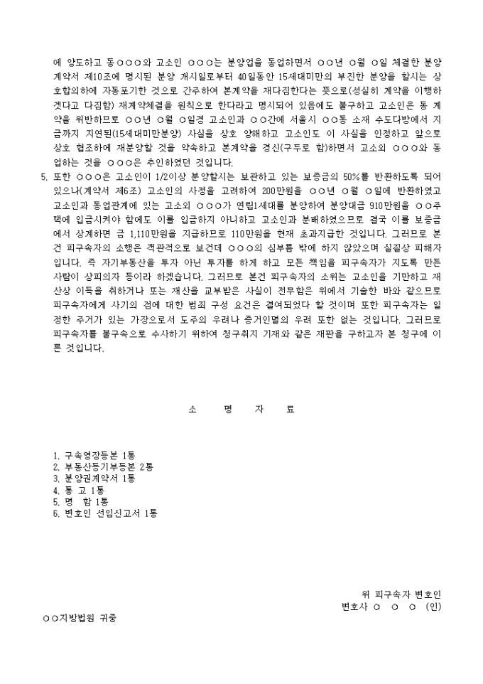 9,000원/월구속적부심사청구서(5) 예제 입니다. 청 구 취 지 피구속자에 대한 석방을 명한다. 라는 재판을 구함. 1. 피구속자에 대한 범죄사실은 구속영장등본 기재 사실과 같다고 함에 있으나 , 피구속자는 ○○년 ○월 ○일경 ○○군 ○○읍 ○○리 ○○번지 답 293평방미터를 대금 4, 000만원에 매입한 피구속자의 소유부동산인 것입니다 ...
