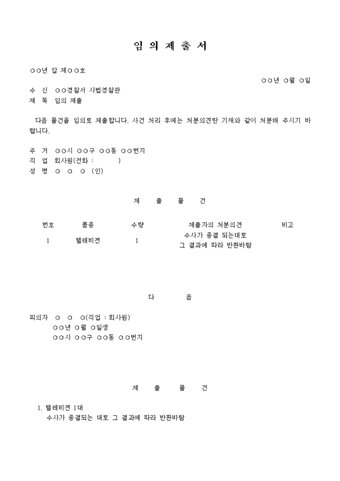 9,000원/월임의제출서 입니다. 수 신 ○○경찰서 사법경찰관 제 목 임의 제출 다음 물건을 임의로 제출합니다. 사건 처리 후에는 처분의견란 기재와 같이 처분해 주시기 바랍니다. ...