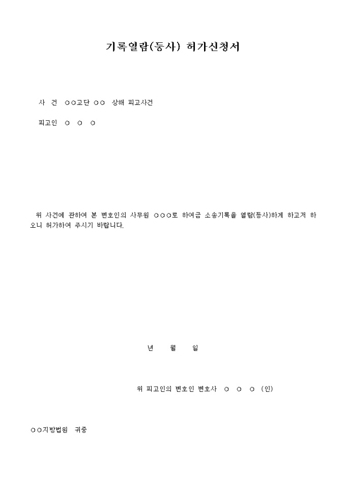 기록열람(등사)허가신청서 예제 입니다. 위 사건에 관하여 본 변호인의 사무원 ○○○로 하여 금 소송기록을 열람(등사)하게 하고저 하오니 허가하여 주시기 바랍니다. ...